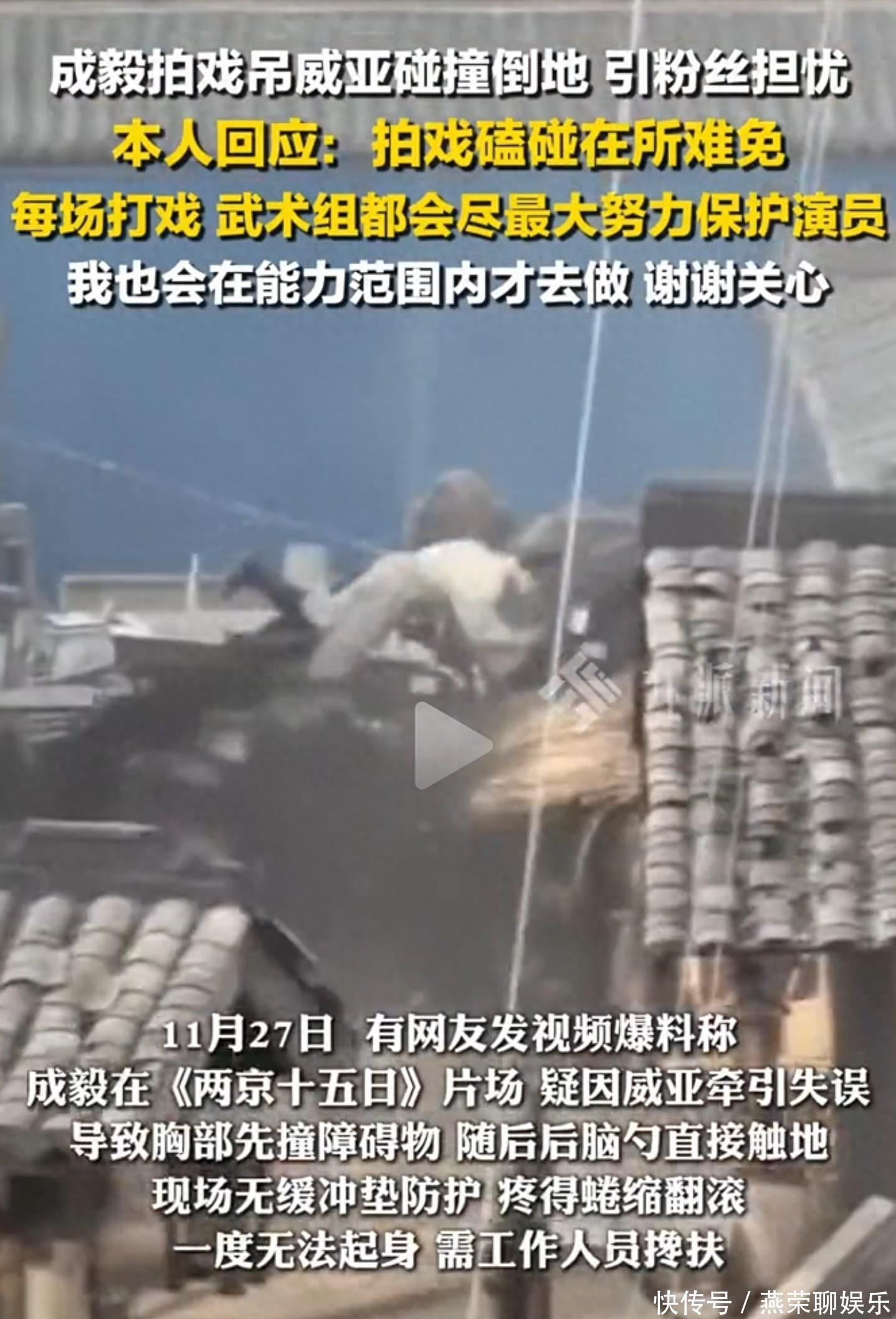 11月27日,有网友曝光了一段成毅在拍摄古装剧《两京十五日》时的惊险视频。画面中,成毅正在进行一场屋顶逃亡的戏份,原本借助威亚在空中做出各种动作。然而,意外突然降临,威亚牵引出现严重失控,成毅的胸部猛地撞击到屋顶的障碍物,随后整个人失去平衡,重重地坠落,后脑勺狠狠地触碰到了地面。更让人气愤的是,现场竟然没有铺设任何缓冲垫进行防护,成毅就这样毫无保护地摔在地上。据现场目击者描述,成毅当场蜷缩成一团,不停地翻滚,脸上满是痛苦的神情,久久无法起身,可见受伤情况不容乐观。